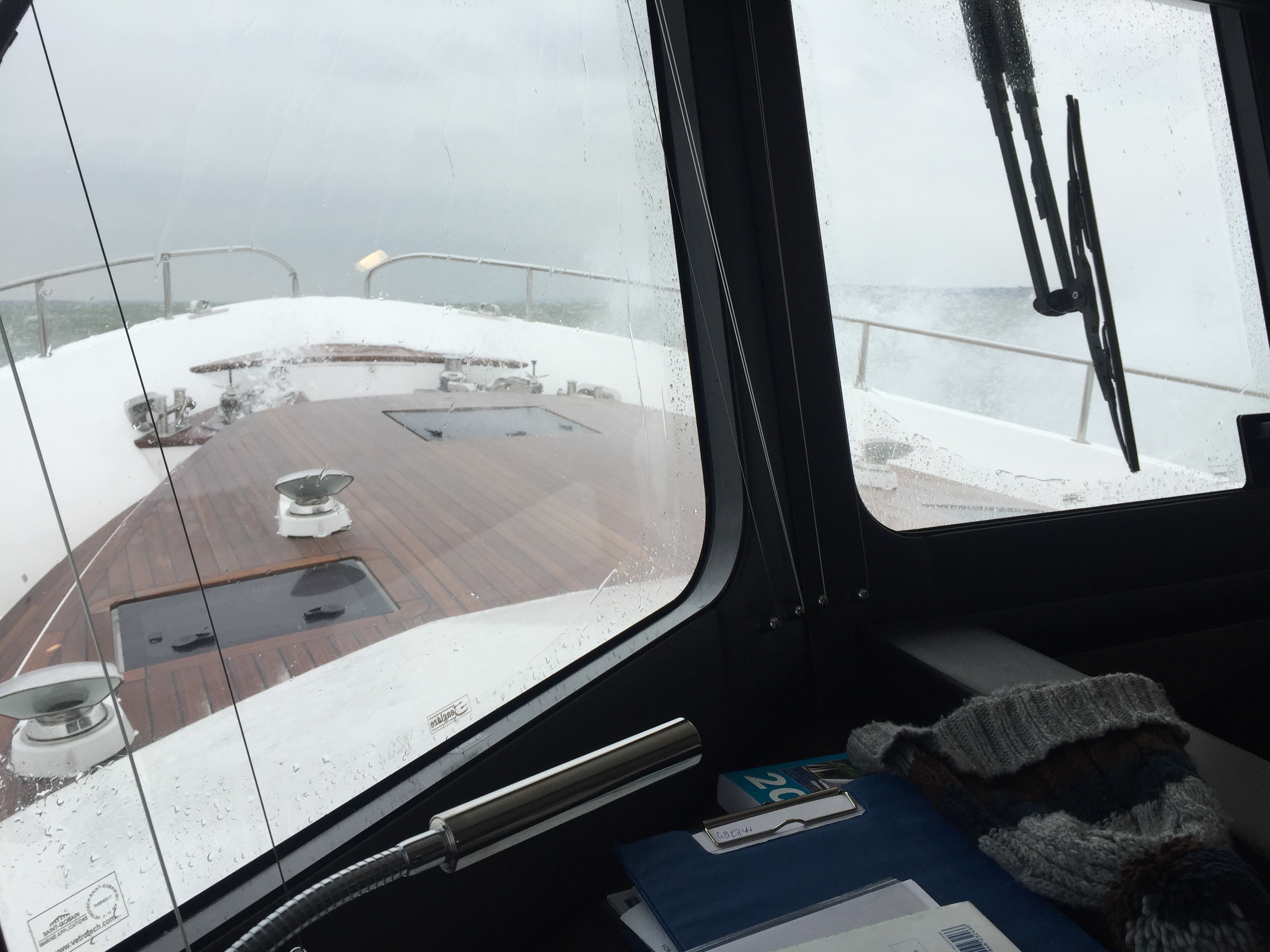 We certainly found the ‘testing’ conditions we were looking for. She was on autopilot and not once did we feel any loss of control. It was amazing. In fact, sitting inside with the heating on it felt like a mildly choppy day cruising at about 16knots. Not sure what the coastguards thought of us, but we and MARESIA were in our element. I had my slippers on!!