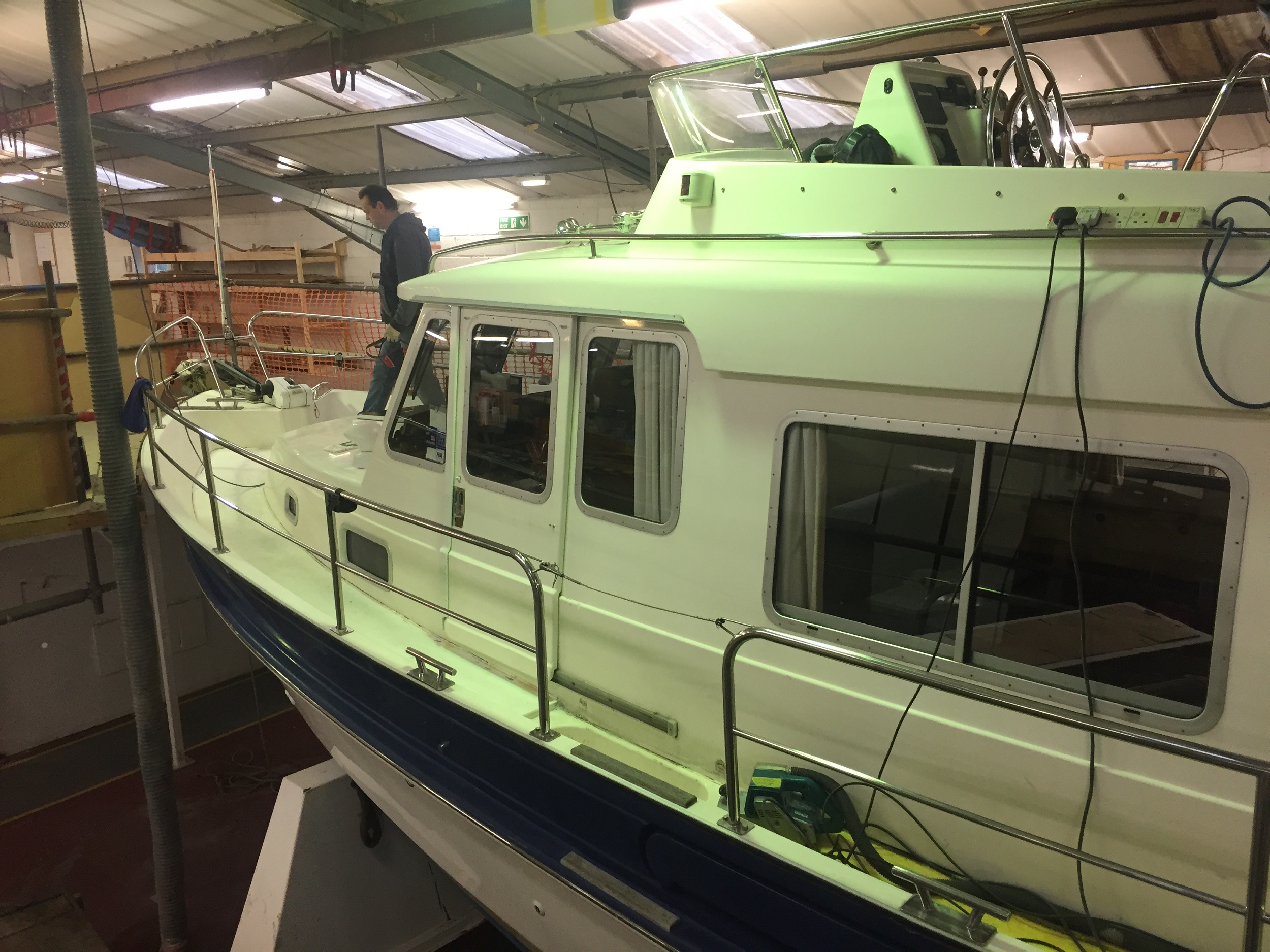 The boat lifted and transported to the confines of Windboats, it was farewell to the boat for the agreed four weeks works duration. During the 4 week period both David & I kept in touch, emails, phone calls some with supportive progress images especially when issues arose. Issues were few and far between, i.e. unforeseen access panels, damaged / broken deck fittings, supplementary refitting of two scuppers – an unusual add-on for clearing deck of low lying water and a couple of canvas buttons.