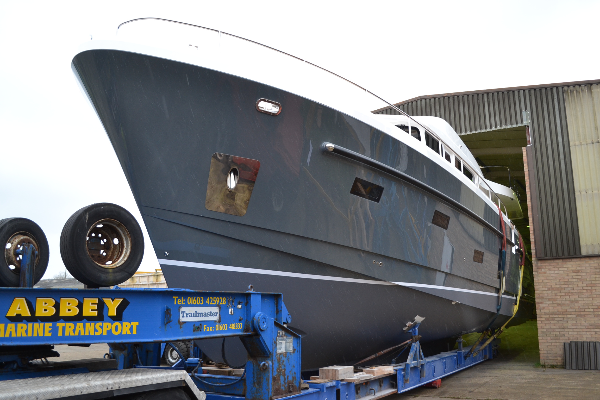 After a construction period of 18 months, MARESIA, the largest yacht ever built on Windboats Marine North Walsham site, is being transported to Alicat Shipyard at Great Yarmouth on Tuesday 7th March, where she will be launched the following week. At 65’ long and towering 20’ above the tarmac she is one of the tallest vessels that Norwich based Abbey Transport have ever moved. Apologies for any travel disruption that may occur, caused by the need to raise power cables along the route, but we are immensely proud of this stunning example of Norfolk yacht-building excellence. There is the possibility that the A47 Acle Straight will be closed or a rolling road block set in place.